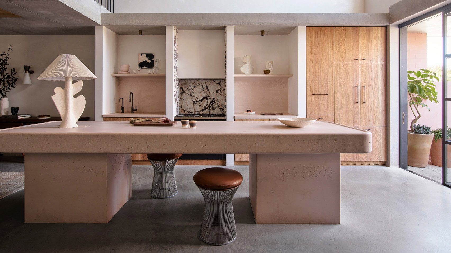 Separuh ruangan lainnya ditempati oleh dapur ganda. Di tengahnya terdapat pulau sarapan tebal yang dibuat dari beton berwarna merah muda, di mana tim dapat berkumpul untuk makan, bertemu klien, atau acara perusahaan.