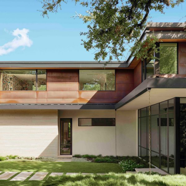 Arsitek LaRue telah melapisi sebuah rumah danau di luar Austin, Texas dengan tembaga, batu kapur, dan kayu ek yang dipatenkan untuk memberikannya “hasil akhir yang hidup”.