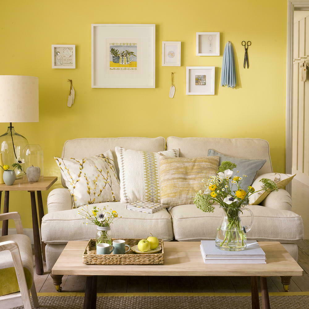Gunakan dinding kosong di belakang sofa Anda untuk menghidupkan skema Anda dan tunjukkan tema apa pun yang Anda miliki. Di sini desain bunga dibawa ke karya seni, dengan meja kecil di mana bunga segar dengan warna yang sama dipajang. Sangkar burung terikat dengan burung-burung di karya seni dan juga di bantal.
