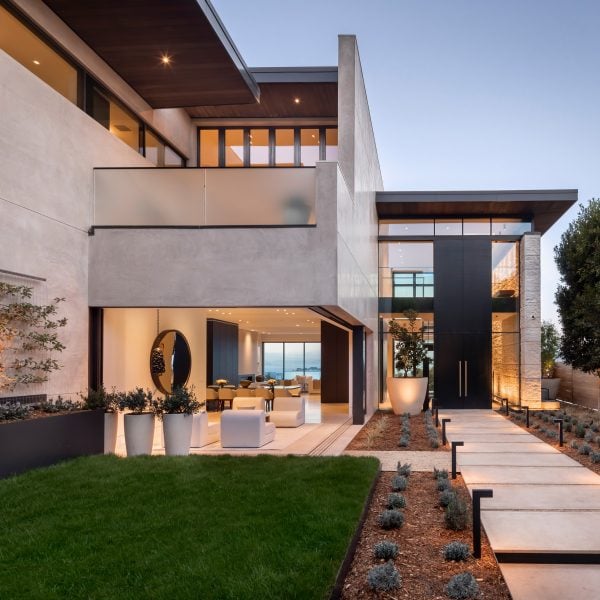 Selesai pada tahun 2021 untuk pengembang Troon Pacific, rumah tiga lantai dengan enam kamar tidur ini terdiri dari amplop bertumpuk yang memungkinkan kaca terus menerus.