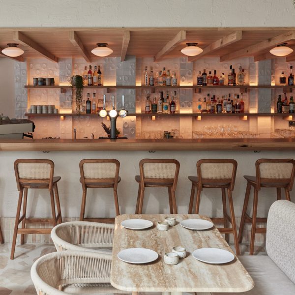 Dinding yang dilapisi plesteran dan limewash menghadirkan kehangatan pada interior yang luas, serta menciptakan rasa konsistensi di seluruh ruang makan dan bar yang berdekatan.