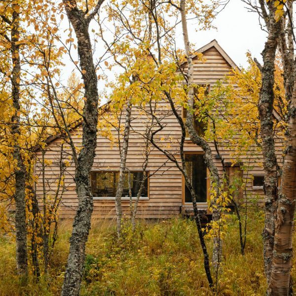 Baik struktur maupun interior rumah dibangun seluruhnya dari kayu, dengan pinus yang diolah Kebony di bagian luar dan lapisan pohon cemara di ruang tamu, dengan lantai balok kayu cemara ujung.