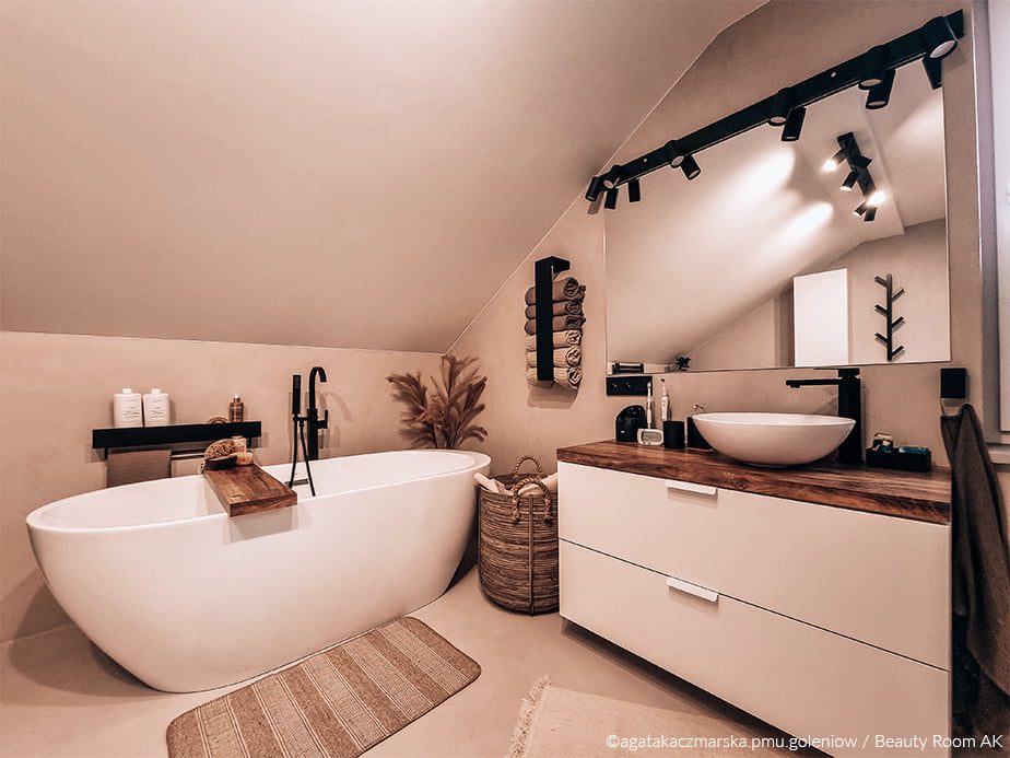 - Keuntungan lain dari microcement adalah keserbagunaannya. Dapat diaplikasikan pada berbagai permukaan seperti ubin, beton, plester dan gypsum. Dengan demikian, dapat digunakan untuk menciptakan tampilan kamar mandi yang unik, disesuaikan dengan preferensi individu.