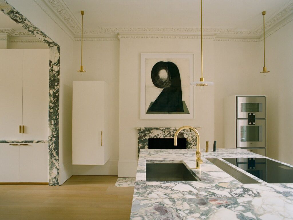 “Proyek ini memulihkan martabat dan skala interior townhouse London barat yang terdaftar enam lantai kelas II * ini, setelah renovasi yang tidak simpatik dan banjir besar di mana air mengalir ke rumah selama beberapa hari dari tangki air loteng. Ruang di setiap lantai dibuka, cornice dicetak ulang, dan dinding diperbaiki dengan mesin bubut tradisional dan plester dengan kapur dan kapur, memberikan bobot dan kelembutan pada ruang. Sisipan baru menggunakan marmer Breccia verde yang langka untuk memberikan kontras, memantulkan dedaunan di luar ke depan dan belakang rumah. Dapur menempati lantai pintu masuk utama rumah, dan merespons skala ruang.