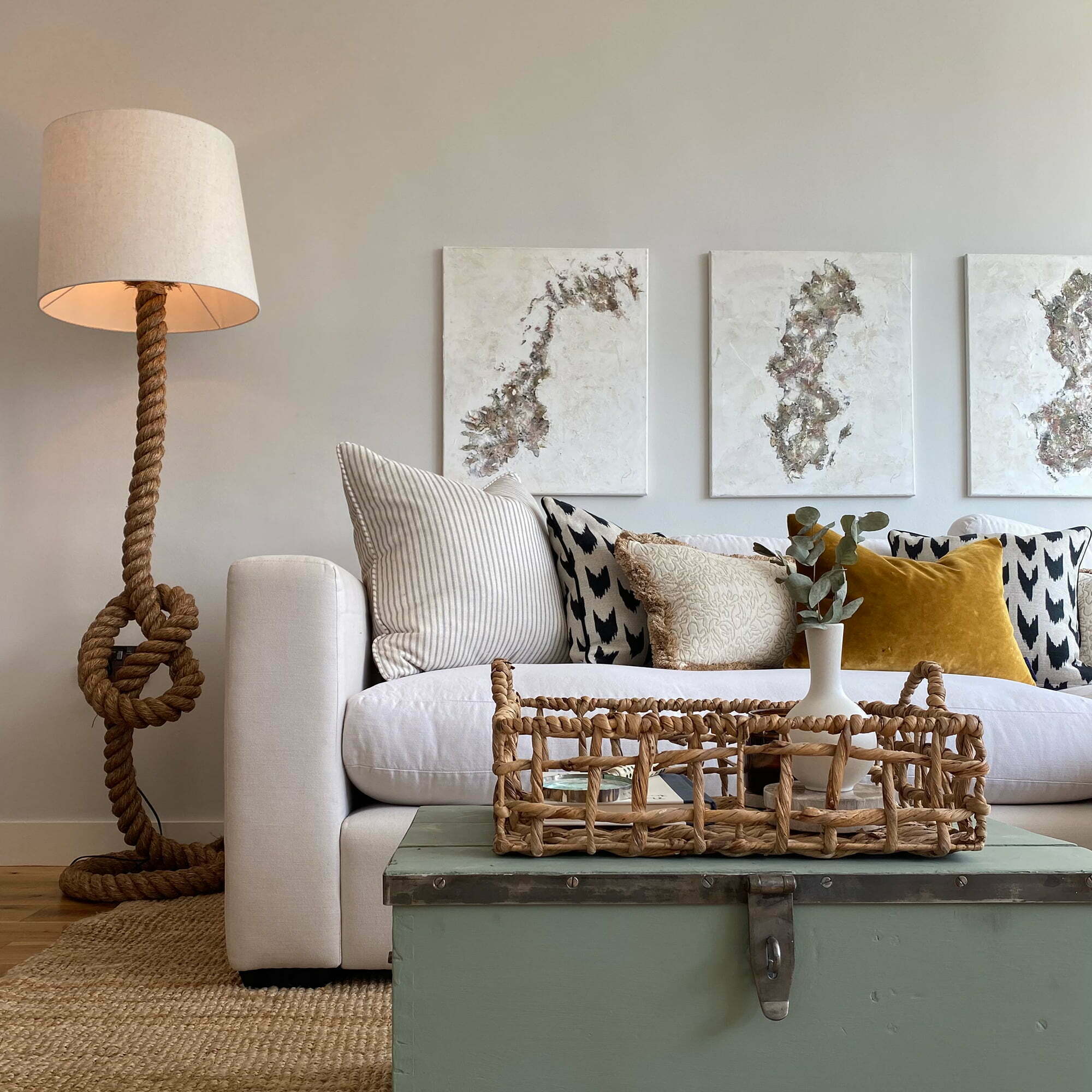 Tampilannya dicirikan oleh warna netral, warna off-white, dan tekstil pedesaan yang semilir seperti linen dan rotan. Alih-alih makeover bahari penuh, tampilan ini disempurnakan, terinspirasi oleh ide-ide ruang tamu pesisir, tetapi mencakup karya seni yang elegan dan aksesori pengrajin. Namun, inti dari estetika ini adalah tentang menciptakan ruang yang hangat dan mengundang.