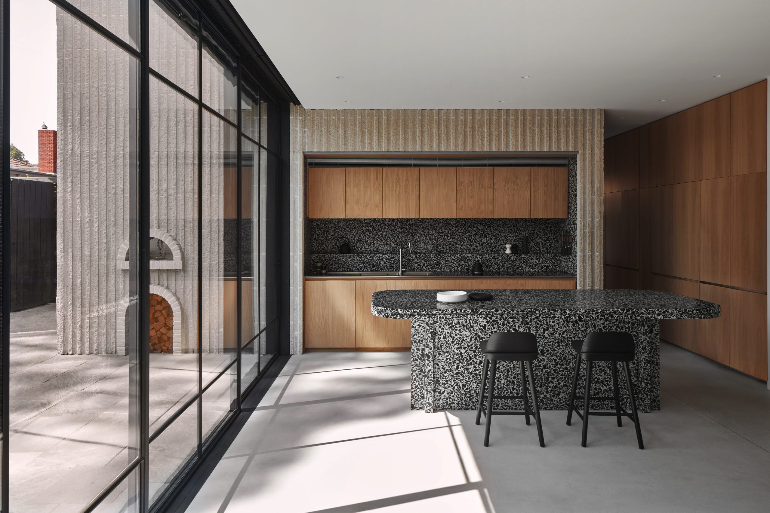Kunci menonjol di rumah adalah bentuk bata. “Kami selalu membayangkan bentuk pahatan memiliki efek lurik vertikal untuk membangkitkan kualitas permainan ringan yang kami sukai di jalur belakang yang ada. Sementara kami menjelajahi banyak bahan dan aplikasi untuk mencapai hal ini, batu bata diletakkan dalam metode corbelled yang akhirnya memungkinkan kami untuk menciptakan efek ini, ”kata Justine. Blok beton setinggi seperempat batu sandhurst dari Adbri Masonry dengan bahan gading adalah pilihan ideal untuk mencapai hal ini. “Kami menginginkan batu bata format yang solid dan ramping tetapi dengan tekstur dan nada yang indah. Blok beton Sandhurst Stone bekerja dengan sempurna dan memungkinkan kami memenuhi niat kami untuk meletakkan batu bata secara vertikal secara bertahap,” tambah Justine.