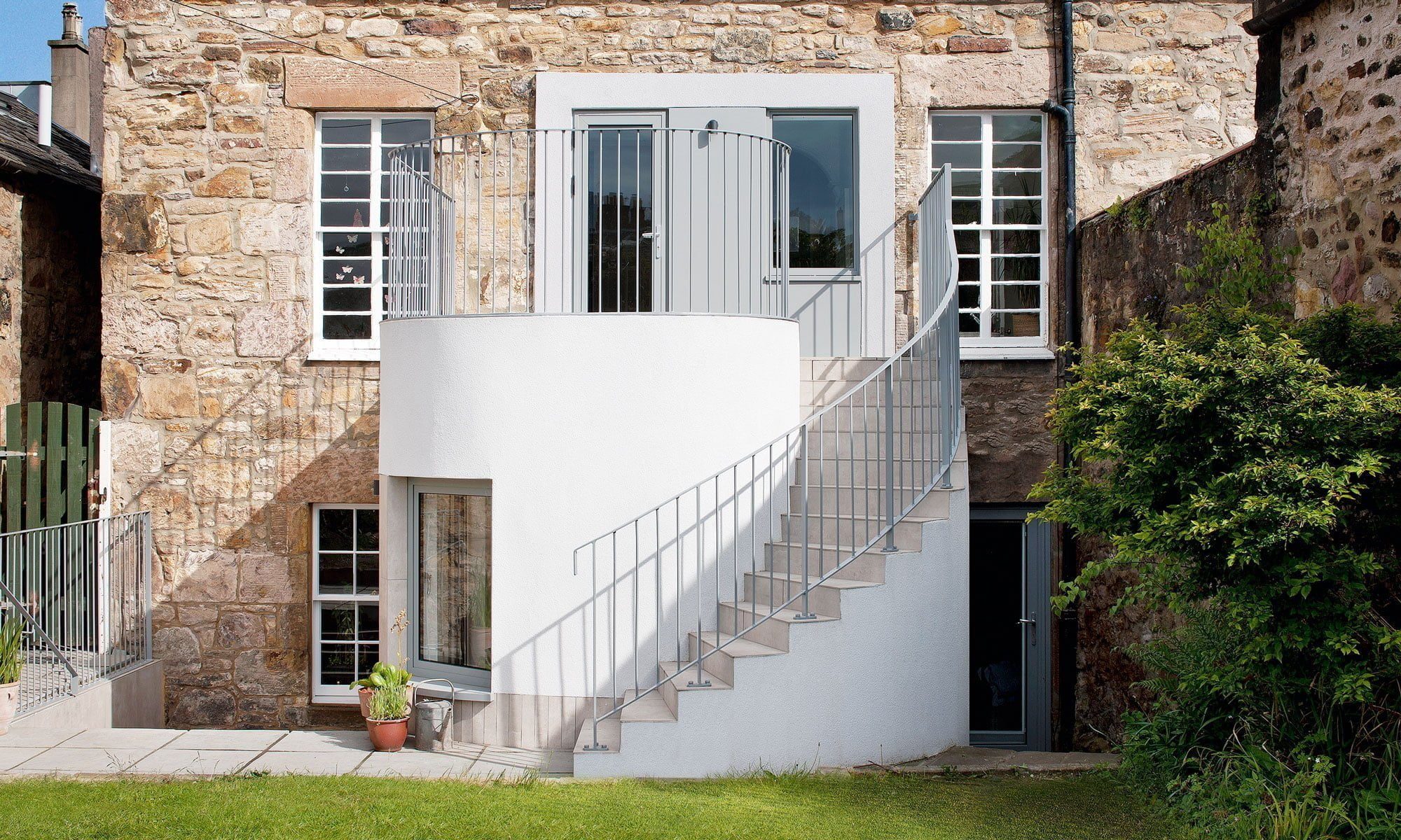 Ekstensi yang diplester dengan tangga di sekitarnya juga berfungsi sebagai teras atap yang bergaya untuk seluruh keluarga. Tangga melengkung baru mengembalikan akses langsung ke taman dan merupakan pernyataan desain yang elegan dan modern.