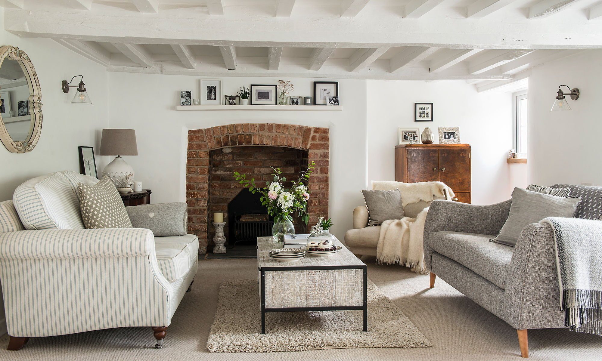 Melukis balok langit-langit rendah berwarna putih telah meringankan ide ruang tamu pedesaan. Sentuhan abu-abu, kelabu tua dan hitam di seluruh rumah, bersama dengan barang antik dan pusaka, menanamkan skema putih cemerlang dengan karakter.