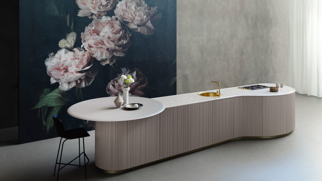 Pintu kabinet pulau itu termasuk pegangan merek Oi dan Accento, yang dirancang agar sesuai dengan alur tiga dimensi pintu.