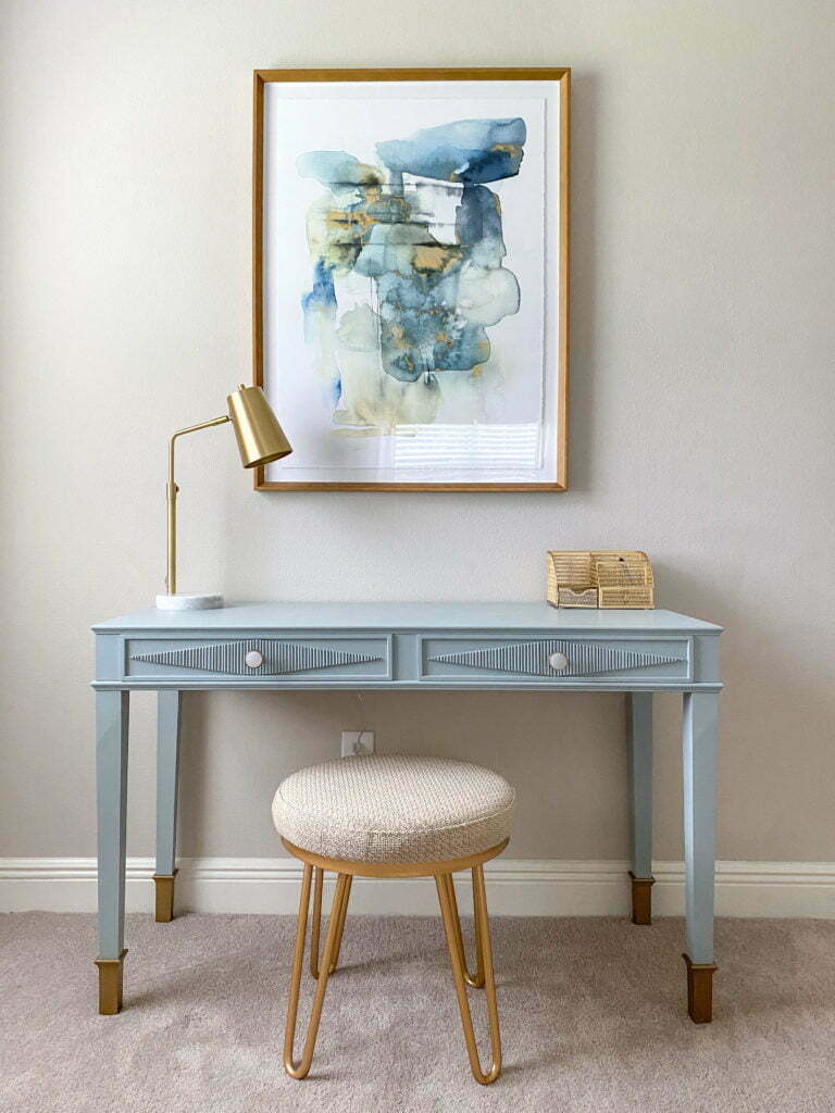 Saya mengecatnya dengan warna biru / abu-abu agar sesuai dengan beberapa fitur lain di rumah saya dan berencana menggunakan bagian ini sebagai titik awal untuk renovasi kamar tidur utama di masa mendatang! Dan jika Anda mengenal saya, Anda tahu bahwa saya harus menambahkan detail emas!