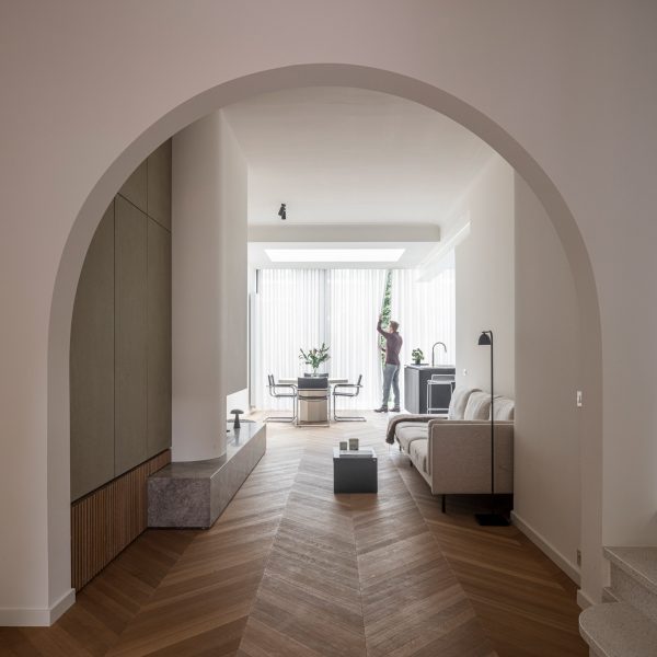 Desainnya – dibuat bekerja sama dengan desainer interior Sarah De Pauw – merayakan detail lengkung bangunan yang ada.