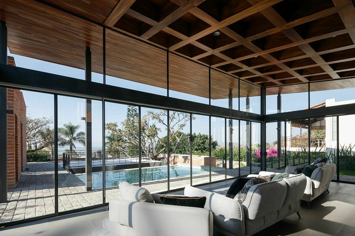 Di dalam Rumah Bergaya Amerika Modern ini ada ruang tamu terbuka yang mengambil alih dapur dan ruang makan sebagai bagian dari ruang tamu. Transisi antara bagian dalam dan luar berjalan mulus, karena dinding kaca dari lantai ke langit-langit dan pintu kaca geser menawarkan antarmuka yang tepat.