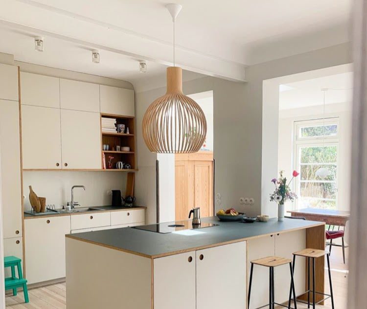 Warna biru lembut telah digunakan di dinding, mengikatnya dengan area lain di rumah dan rak dari dinding ke dinding telah ditempatkan di atas pintu – sesuatu yang sering Anda lihat di rumah Denmark (seperti ini).