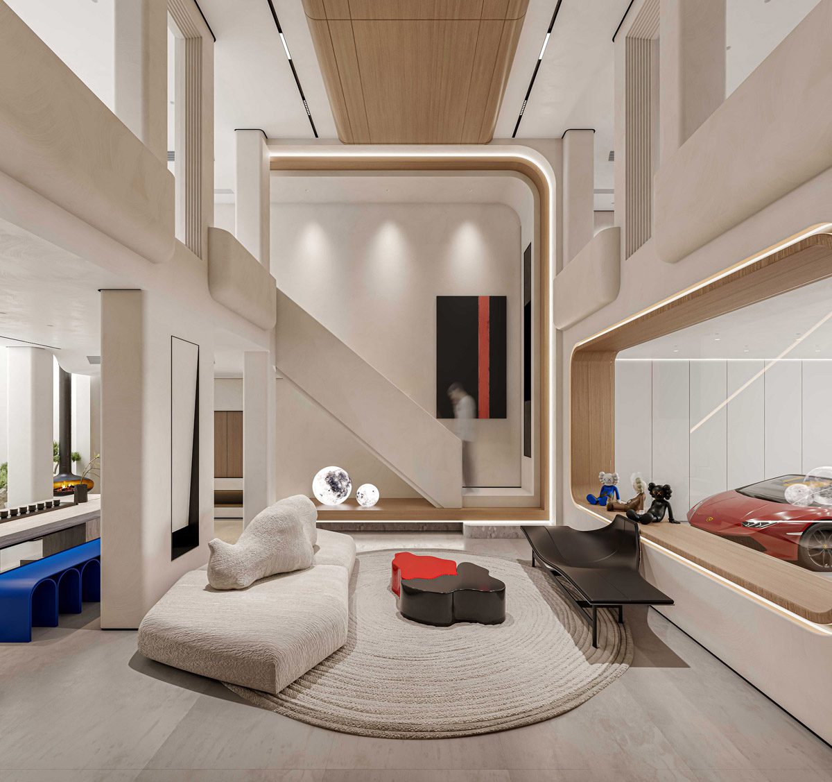 Rumah keluarga futuristik yang luar biasa ini memiliki bingkai interior yang unik dan potongan aksen yang menarik. Interior luas yang divisualisasikan oleh Jingai Vision mempesona di setiap belokan. Siluet furnitur modern, permukaan berani dalam warna primer, dan elemen pahatan trendi berpadu untuk menciptakan perjalanan artistik penemuan di sekitar rumah. Area tertentu yang menarik adalah ruang hiburan rumah yang sensasional, di mana kanopi strip LED dan lantai hitam reflektif menciptakan suasana seperti klub malam. Rumah ini juga dilengkapi dengan suite tamu lantai pertama yang mewah dengan dapur makan berkualitas dan kamar tidur senior yang dirancang dengan mempertimbangkan selera penghuninya yang lebih tradisional.