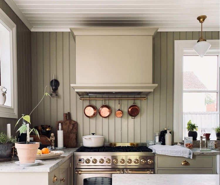 Di dapur, Lovisa memilih kombinasi warna sage kering, kastanye panggang, dan krim.