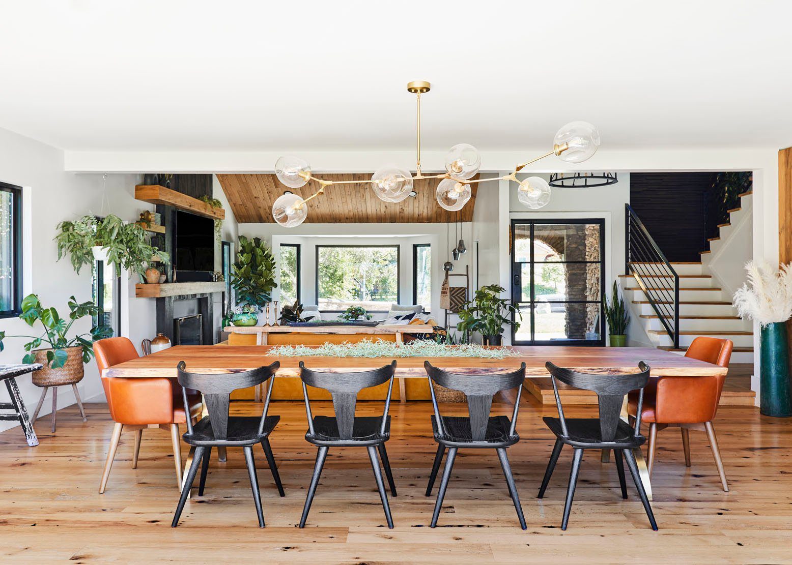 Ruang tamu terletak di seberang ruang makan dan sangat nyaman karena variasi warna dan tekstur. Berbagai warna kayu, bantal beludru, bentuk organik, dan permadani berumbai semuanya bekerja sama untuk menciptakan nuansa yang nyaman dan hidup. Sofa kuning dibuat khusus oleh Clad Home dan seperti yang Anda lihat, sofa itu dibuat agar pas dengan ruang ini dengan sempurna, menciptakan zona tersendiri untuk memisahkan ruang tamu dari ruang makan. Dalam denah lantai konsep terbuka seperti mereka, sangat penting untuk menata furnitur dengan cara yang membedakan ruang yang berbeda.