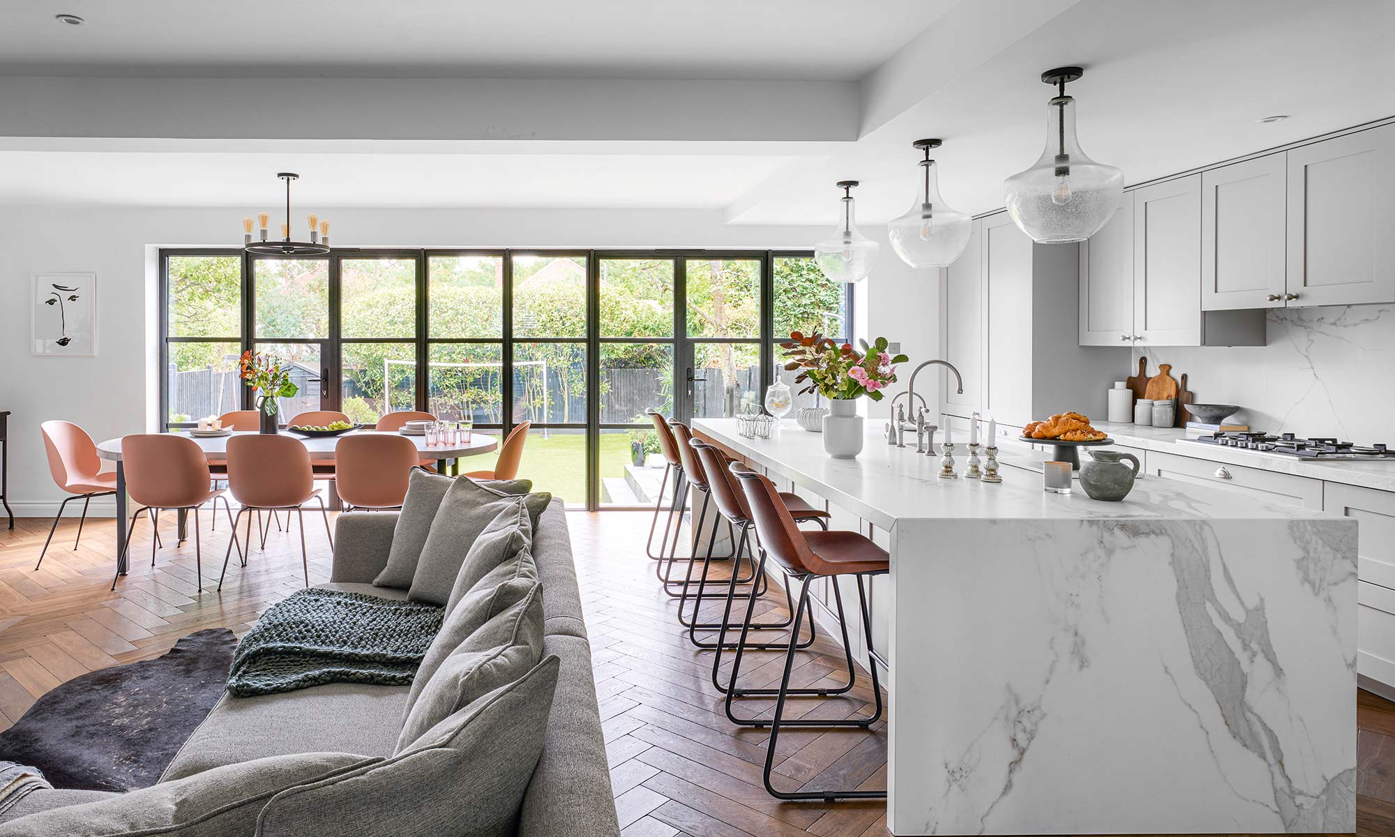 Ada tiga hal yang harus dimiliki pemilik dalam pembaruan Rumah Perkotaan kontemporer ini – lantai kayu keras gelap yang menyeluruh, pintu Prancis berbingkai logam di bagian belakang seluruh rumah, dan meja marmer kontras yang lebih terang.