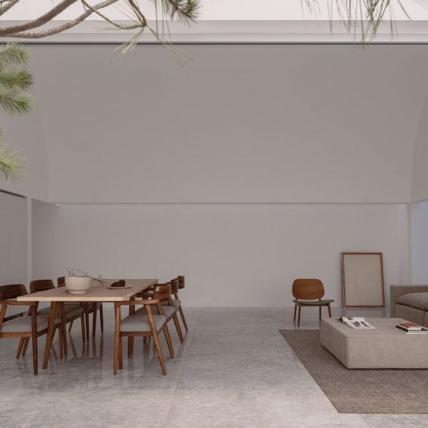 Dari luar, rumah itu berupa balok padat dengan pintu masuk yang tersembunyi. Di interior, geometri bulat melembutkan ruang. Plesteran putih melayani bahan eksterior dan interior, dan lempengan marmer putih dan abu-abu menutupi lantai.
