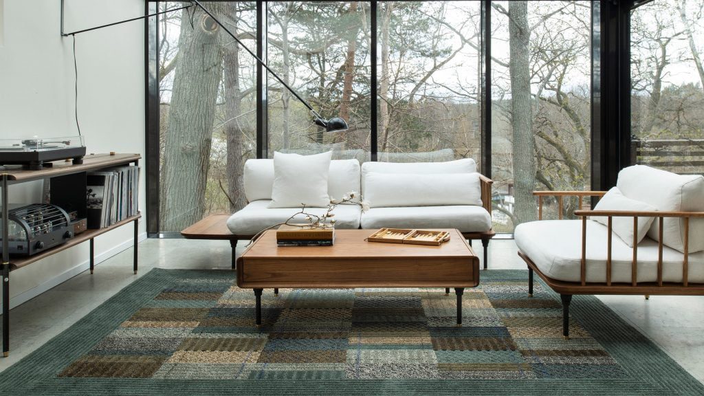Di ruang tamu ini, permadani berumbai dari desainer Swedia Ellinor Eliasson berfungsi sebagai pusat perhatian dan memberi ruang tampilan tekstur yang hangat dan kaya.