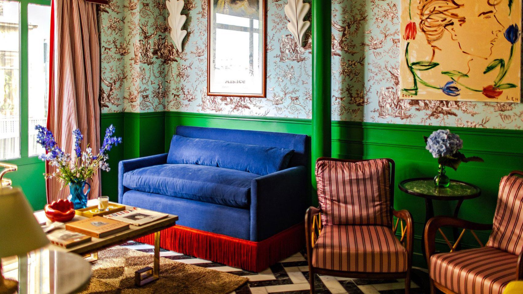 Dinding kontemporer berwarna hijau kacang sangat kontras dengan wallpaper chintzy dan sofa beludru lembut di kamar-kamar Hotel Les Deux Gares di Paris.