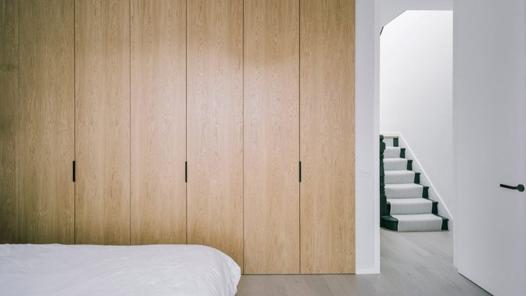 Arsitek Matthew Giles merancang serangkaian unit penyimpanan kayu ek putih untuk rumah Wakehurst Road di London, termasuk dinding lemari yang dikupas di salah satu kamar tidur.