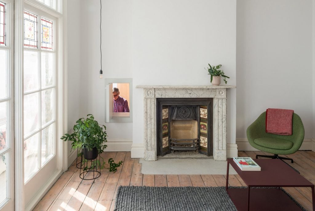 Plester berwarna dan cornicing segar juga digunakan untuk dinding ruang tamu di Tsubo House di Hackney, yang dirombak oleh praktik arsitektur Fraher & Findlay.
