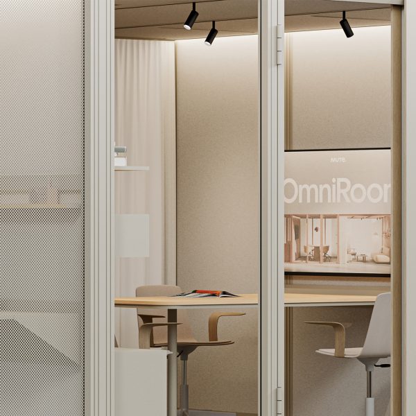 OmniRoom menawarkan 100 “kamar” rancangan arsitek untuk dipilih, termasuk workstation, area lounge, ruang konferensi, dan tempat minum kopi, dengan bingkai dan dinding yang terbuat dari cat dan 100 persen aluminium yang dapat didaur ulang sepenuhnya.