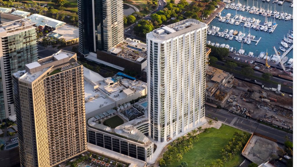 Kō’ula, yang berarti “tebu merah” dalam bahasa asli Hawaii, adalah tanaman lokal dengan struktur memutar yang menjadi pengaruh besar pada fasad menara.