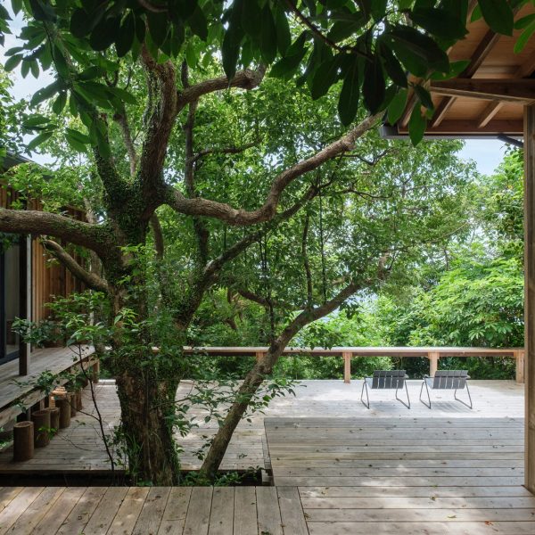 Bangunan bersarang di antara pepohonan yang ada dan ditinggikan di atas lantai hutan untuk mendorong aliran udara alami dari bukit ke laut.