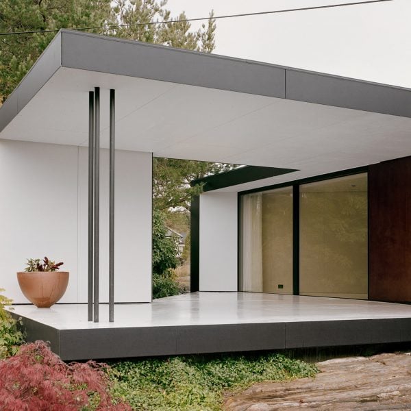 Interior yang hangat dan terang kontras dengan kelongsong eksterior yang gelap, yang terdiri dari panel semen fiber dan detail baja lapuk. Teras terlindung ditutup dengan panel semen fiber putih untuk menekankan hubungan dengan ruang hidup internal.