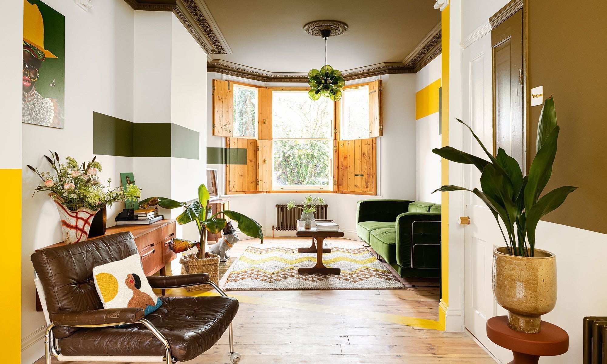 ‘Saya tahu saya ingin mewarnai blok di sini menggunakan hijau dan kuning favorit saya, tetapi kami membutuhkan waktu berjam-jam untuk mendapatkan pola dinding geometris yang ditandai menggunakan pita pengukur, tingkat semangat, dan selotip,’ katanya. ‘Tetapi skema yang telah selesai persis seperti yang saya harapkan ketika saya merencanakannya, dan itu adalah salah satu ide dekorasi dinding ruang tamu favorit saya.’