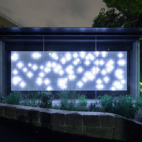 Karya seni menggunakan lampu hijau di siang hari dan lampu putih di malam hari untuk menciptakan rangkaian pola yang terus berubah sehingga bangunan selalu tampil beda bagi orang yang lewat.