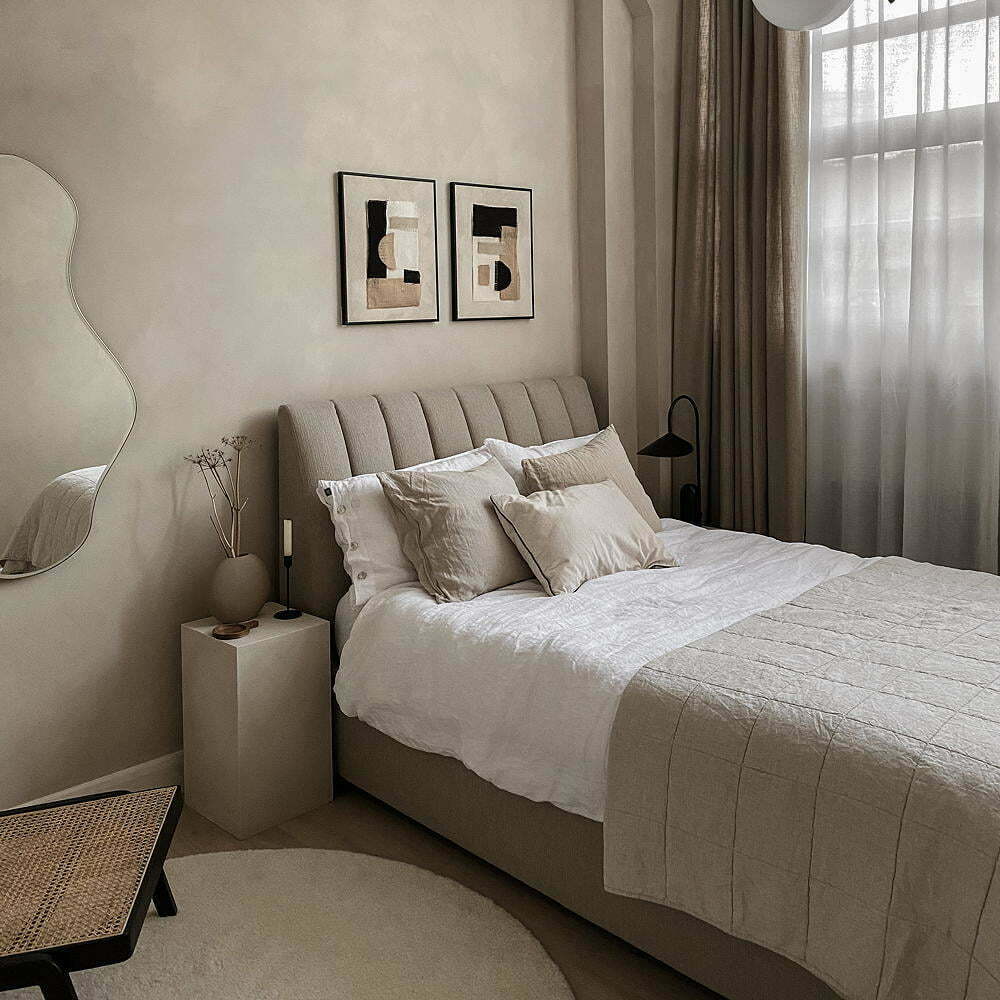 Di kamar tidur utamanya, Lisa memilih gaya yang serupa, dengan palet netral dan cat kapur struktural yang ia bawa ke langit-langit untuk memberi ruangan nuansa kepompong. Kami menyukai perpaduan warna netral, cokelat, beige, dan hanya aksen hitam aneh di ruangan ini, yang dibuat sederhana dengan garis-garis yang rapi sehingga dekorasi dan skema warna dapat berbicara.