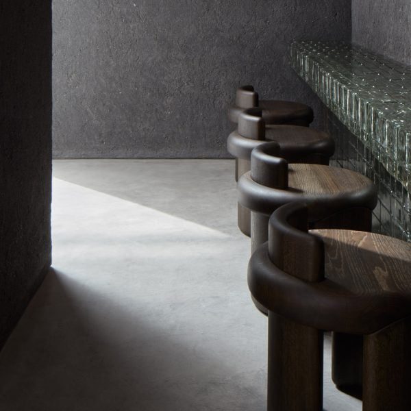 Interiornya menampilkan kolom dan dinding monolitik yang diinformasikan oleh arsitektur kuil, bersama dengan tempat duduk yang dilapisi kain dan partisi kaca bertekstur yang berkontribusi pada perasaan “intrik dan misteri”, kata studio tersebut.