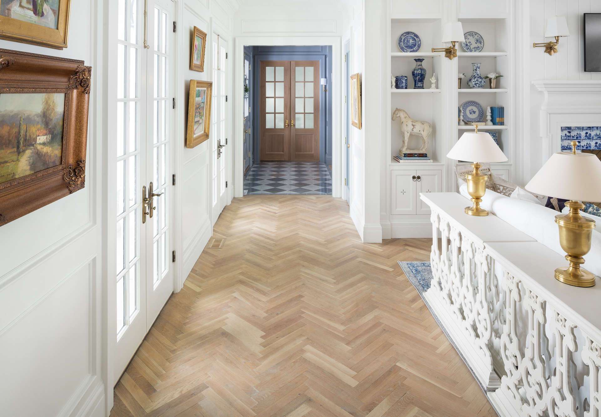 Pola tulang ikan herring dengan kayu oak putih? Um … ya tolong !! Lihat itu!! Sementara pekerjaan memasang pola seperti ini terlihat mahal, kayunya sepertinya adalah papan standar 2 inci … yang sangat ekonomis. Saya sangat menyukai tampilan ini dan akan langsung memasangnya!