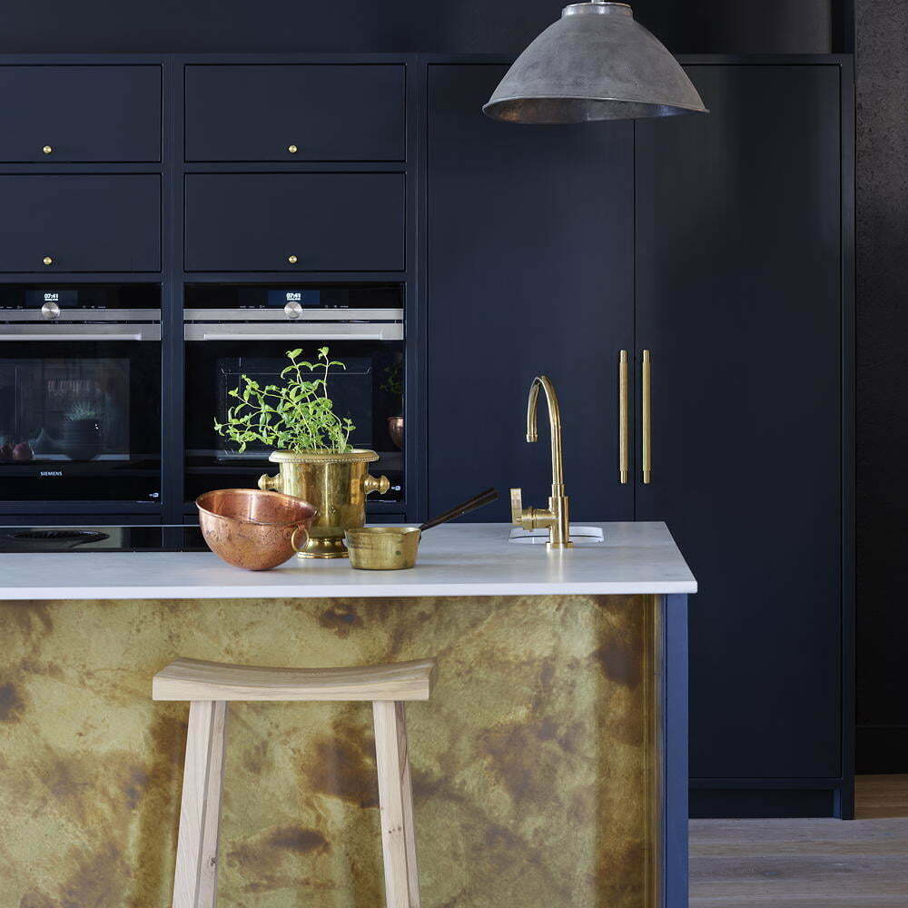 Di sini, lemari berpernis biru tua yang nikmat telah dipasangkan dengan sebuah pulau yang memiliki bagian atas emas yang menarik untuk efek yang menarik perhatian – dan meskipun emas dalam gambar ini tidak dipernis, tidak ada yang bisa dikatakan bahwa Anda tidak bisa mendapatkannya terinspirasi dari desainnya.