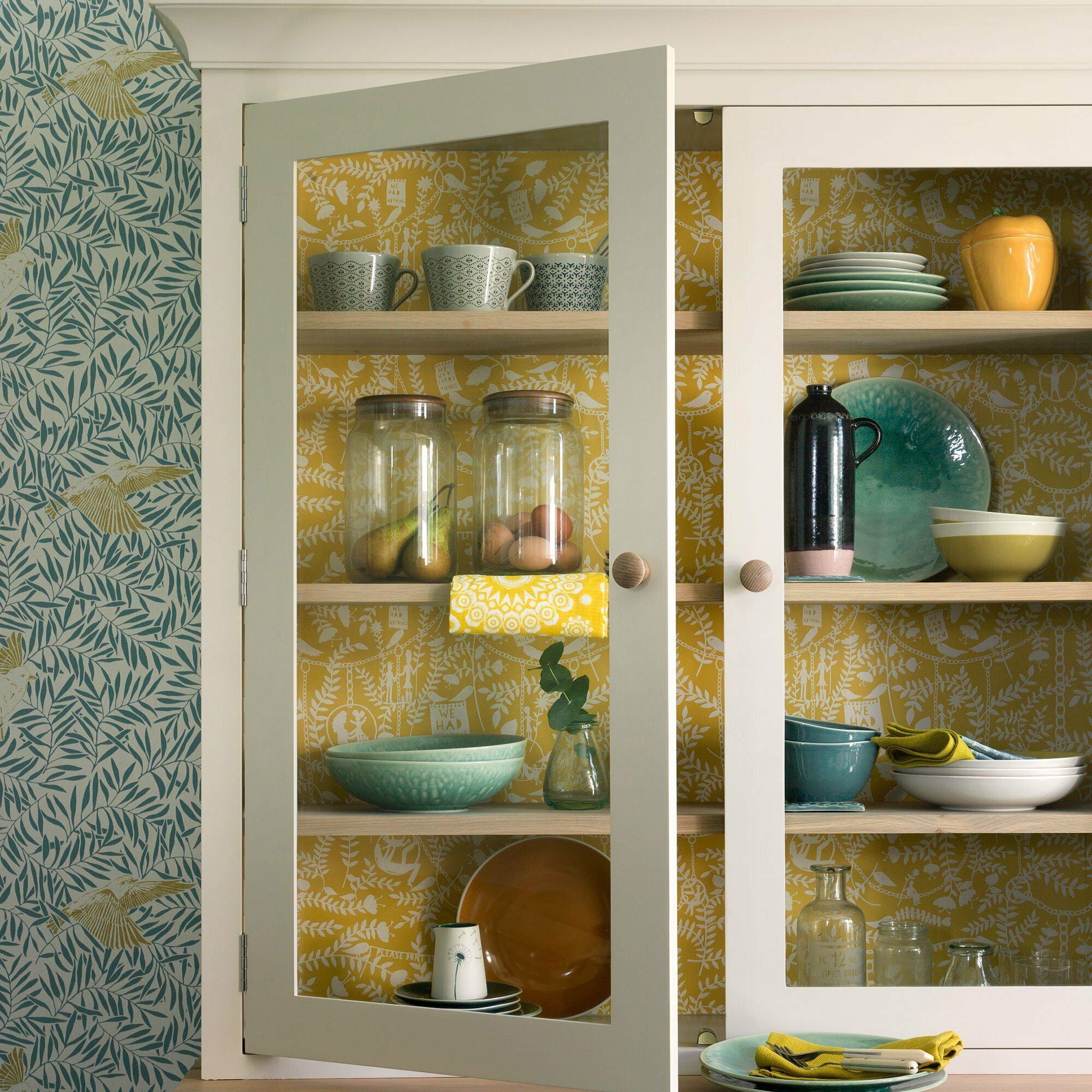 Melapisi bagian dalam lemari atau rak built-in memungkinkan peralatan makan dan gelas Anda menjadi lebih seperti pajangan.